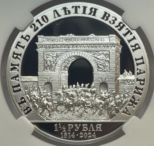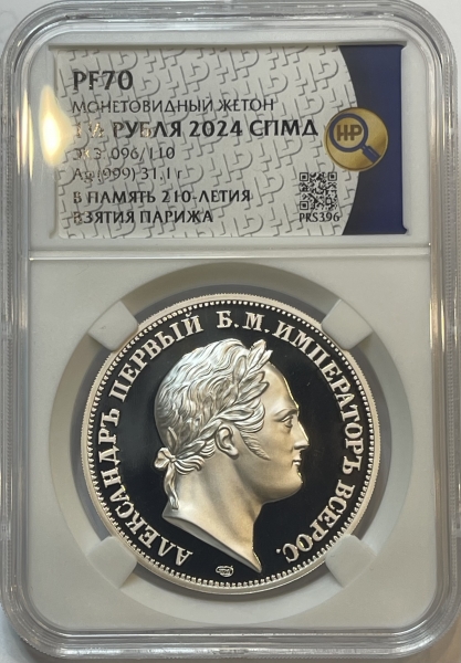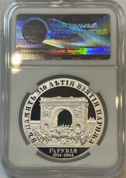 Монетовидный жетон 1,5 рубля 2024г. СПМД "В память 210-летия вступления Русских войск в Париж" серебро 999 пробы, 31,1г., Тираж 110 шт., в слабе ННР PROOF 70
