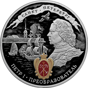рельефные изображения портрета Петра I в профиль, Петропавловской крепости, кораблей, идущих по Неве, и ленты с надписью «САНКТ-ПЕТЕРБУРГ», а также выполненное в рельефе с цветным покрытием одно из первых изображений герба Санкт-Петербурга; внизу вдоль канта — рельефная надпись: «ПЕТР I • ПРЕОБРАЗОВАТЕЛЬ».