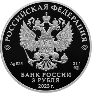 рельефное изображение Государственного герба Российской Федерации, над ним вдоль канта – надпись полукругом: «РОССИЙСКАЯ ФЕДЕРАЦИЯ», обрамленная с обеих сторон сдвоенными ромбами, под гербом: слева – обозначения драгоценного металла и пробы сплава, справа – содержание химически чистого металла и товарный знак монетного двора, внизу в центре в три строки – надпись: «БАНК РОССИИ», номинал монеты: «3 РУБЛЯ», год выпуска: «2023 г.».