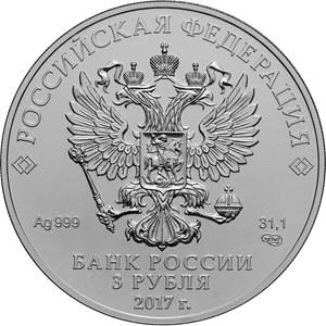 • АверсРасположено рельефное изображение Государственного герба Российской Федерации, имеются надписи: «РОССИЙСКАЯ ФЕДЕРАЦИЯ», «БАНК РОССИИ», номинал монет — «3 РУБЛЯ» и дата — «2017 г.», обозначение металла по Периодической системе элементов Д. И. Менделеева, проба сплава, товарный знак Санкт-Петербургского монетного двора и масса драгоценного металла в чистоте.