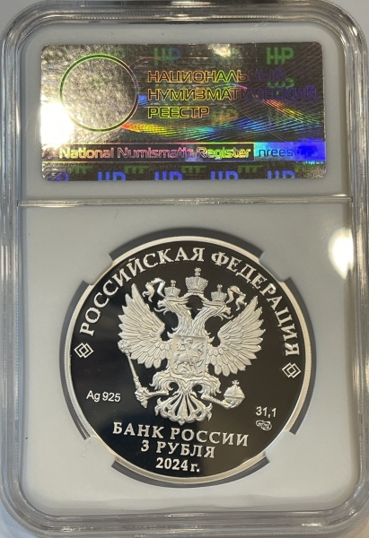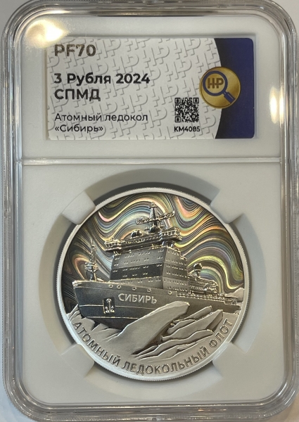 Серебряная монета 3 рубля "Ледокол Сибирь" 2024г, 31,1г в слабе ННР PROOF 70