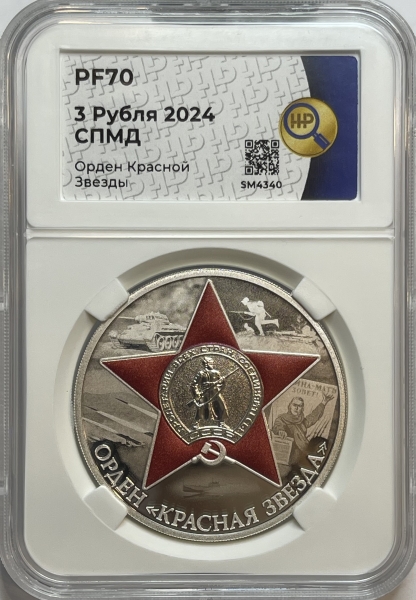 Серебряная монета 3 рубля "Орден Красной Звезды" 31,1 г. Ag 925 , 2024 г. в слабе ННР PROOF 70