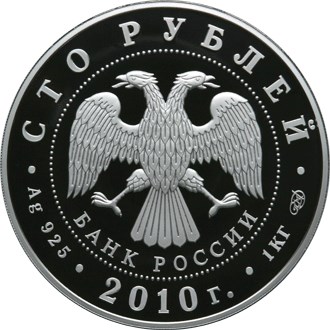 в центре диска - эмблема Банка России (двуглавый орел с опущенными крыльями, под ним - надпись полукругом "БАНК РОССИИ"), обрамленная кругом из точек и надписями по кругу: вверху - "СТО РУБЛЕЙ", внизу: слева - обозначения драгоценного металла и пробы сплава, в центре - дата выпуска "2010 г.", справа - содержание химически чистого металла и товарный знак монетного двора.