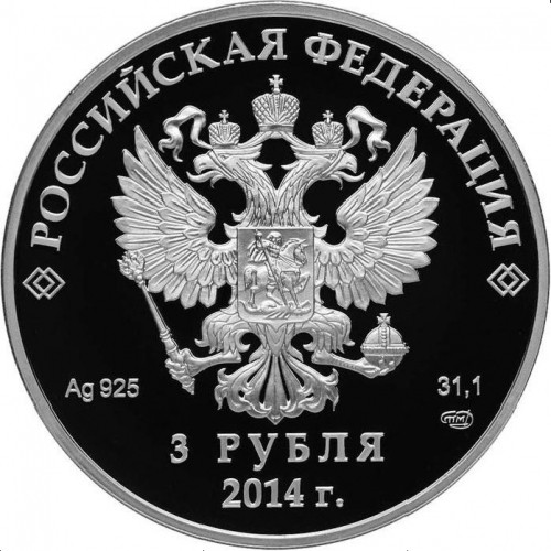 на зеркальном поле диска - рельефное изображение Государственного герба Российской Федерации, над ним вдоль канта - надпись полукругом: "РОССИЙСКАЯ ФЕДЕРАЦИЯ", внизу под гербом: слева - обозначения металла по Периодической системе элементов Д.И. Менделеева и пробы сплава, справа в две строки - обозначение массы драгоценного металла в чистоте и товарный знак Санкт-Петербургского монетного двора, внизу в центре в две строки - номинал монеты: "3 РУБЛЯ" и дата: "2014 г.".
