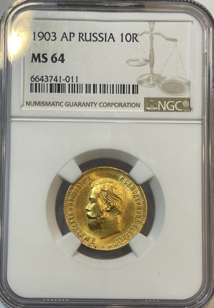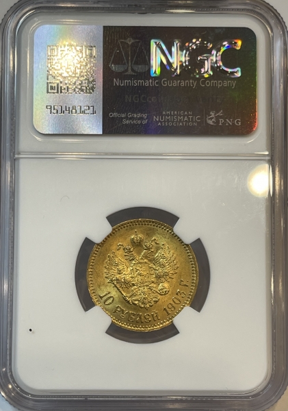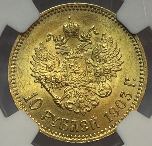 Золотая монета 10 рублей Николай II 1903г., в слабе NGC MS 64