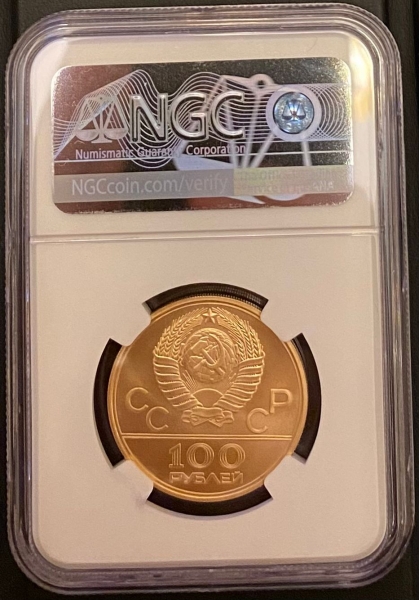 Золотая монета 100 рублей "Аллегория Спорт и Мир" Олимпиада 80, 15,55г., 1977г. в слабе NGC MS 69