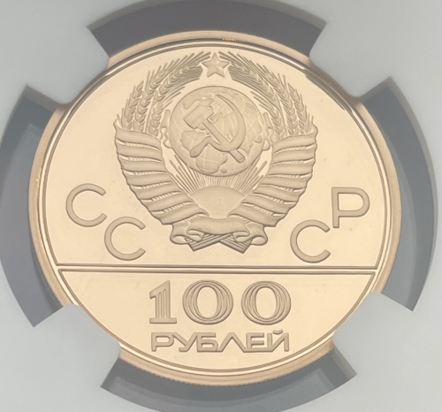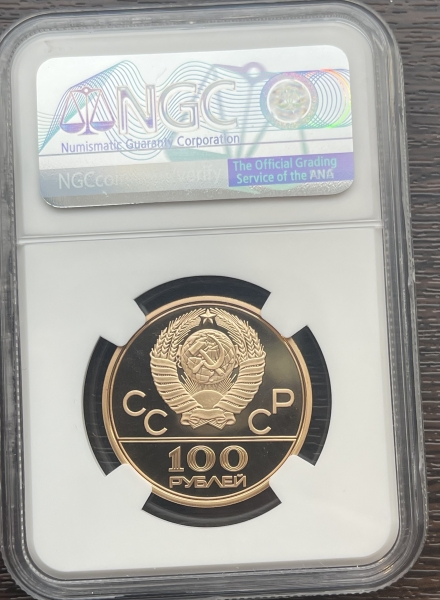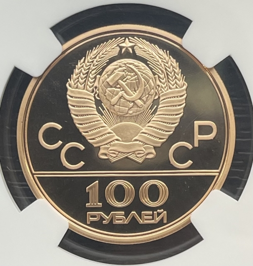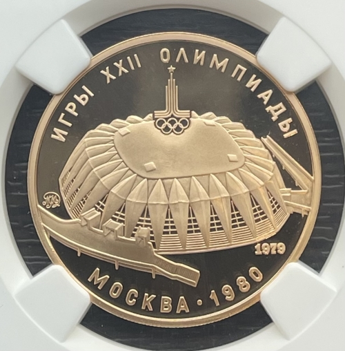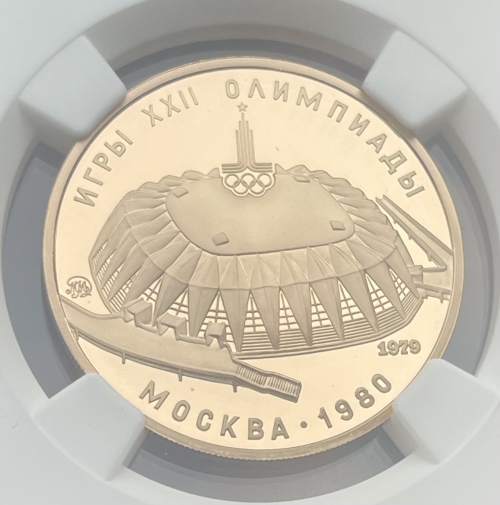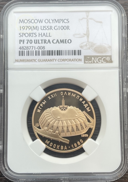Золотая монета 100 рублей "Спортивный зал Дружба" 1979г. в слабе NGC PROOF 70 ULTRA CAMEO