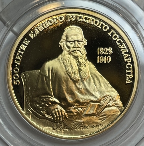 Золотая монета 100 рублей "Лев Толстой 1828-1910гг." Русский писатель, 1991г., 15,55г., Au 900, ММД