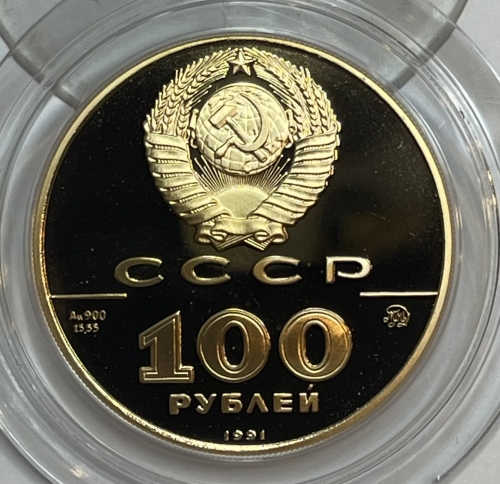 Сверху герб СССР с 15 витками ленты, под ним буквы «СССР», ниже слева и справа черта, под чертой слева химическое обозначение «Au» и проба «900» металла из которого сделана монета, под ними чистый вес драгоценного металла «15,55», под чертой справа монограмма монетного двора «ММД», ниже обозначение достоинства монеты цифра «100» и ниже слово «РУБЛЕЙ», внизу у канта год выпуска монеты «1991».