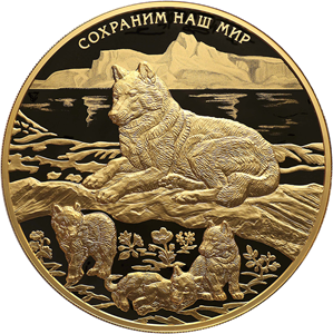 рельефное изображение полярной волчицы с волчатами на фоне выполненных в технике лазерного матирования изображений водной поверхности и скал; вверху по окружности имеется надпись: «СОХРАНИМ НАШ МИР».