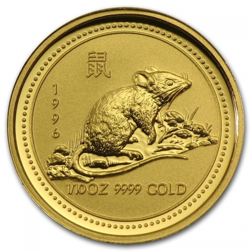 На реверсе изображен символ 1996 года - Мышь, иероглиф, означающий "Мышь", вес монеты (1/10 oz - одна десятая тройской унции), проба (9999 gold), год выпуска (1996).