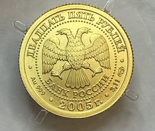 в центре диска – эмблема Банка России (двуглавый орел c опущенными крыльями, под ним надпись полукругом «БАНК РОССИИ»), обрамленная кругом из точек и надписями по кругу: вверху – «ДВАДЦАТЬ ПЯТЬ РУБЛЕЙ», внизу – «2005 г.», слева – обозначение металла, проба сплава, справа – содержание драгоценного металла в чистоте и товарный знак монетного двора.