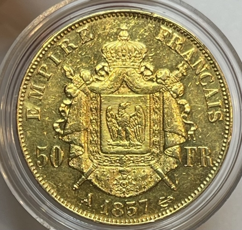 Золотая монета 50 франков Наполеон III 1857 г.,Au 900