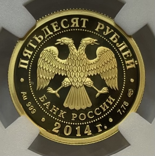 В центре диска – эмблема Банка России (двуглавый орел с опущенными крыльями, под ним надпись полукругом "БАНК РОССИИ"), обрамленная кругом из точек и надписями по кругу – вверху: "ПЯТЬДЕСЯТ РУБЛЕЙ", внизу: слева – обозначения драгоценного металла и пробы сплава, в центре – дата выпуска "2014 г.", справа - содержание химически чистого металла и товарный знак монетного двора.