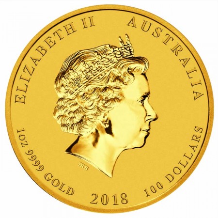 На аверсе изображен профиль королевы Елизаветы II. Сверху надписи: «ELIZABETH II» (Елизавета II) и «AUSTRALIA» (Австралия). Также внизу указаны вес (1 oz – 1 унция), проба (9999), название металла (Au - серебро), год (2018) и номинал монеты – 100 австралийских долларов.