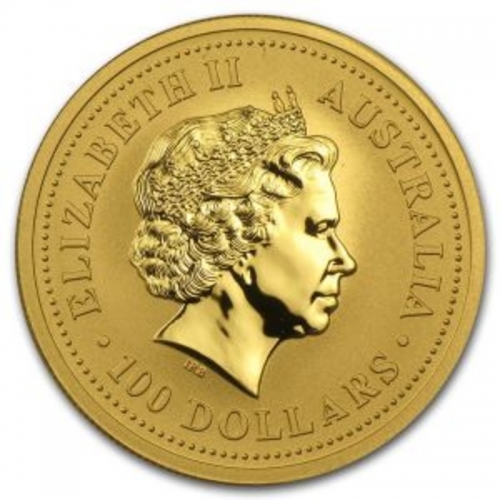 • На аверсе золотой монеты Австралии "Лунный календарь I - Год Собаки" - профиль королевы Великобритании Елизаветы II. Сверху надписи на английском: "Elizabeth II" и "Australia". Снизу - проба золота и вес монеты (1 тройская унция золота 9999 пробы), год выпуска монеты (2006) и номинал монеты (100 австралийских долларов).