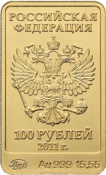 • Аверс: в центре - рельефное изображение Государственного герба Российской Федерации (двуглавый орел, поднявший вверх распущенные крылья. Орел увенчан двумя малыми коронами и - над ними - одной большой короной, соединенными лентой. В правой лапе орла - скипетр, в левой - держава. На груди орла, в щите - всадник в плаще на коне, поражающий копьем опрокинутого навзничь и попранного конем дракона), надписи - над гербом в две строки: "РОССИЙСКАЯ ФЕДЕРАЦИЯ", под гербом в две строки - номинал: "100 РУБЛЕЙ" и дата: "2011 г.", внизу вдоль канта: слева - товарный знак монетного двора, в центре - обозначения металла и его проба, справа - содержание драгоценного металла в чистоте.